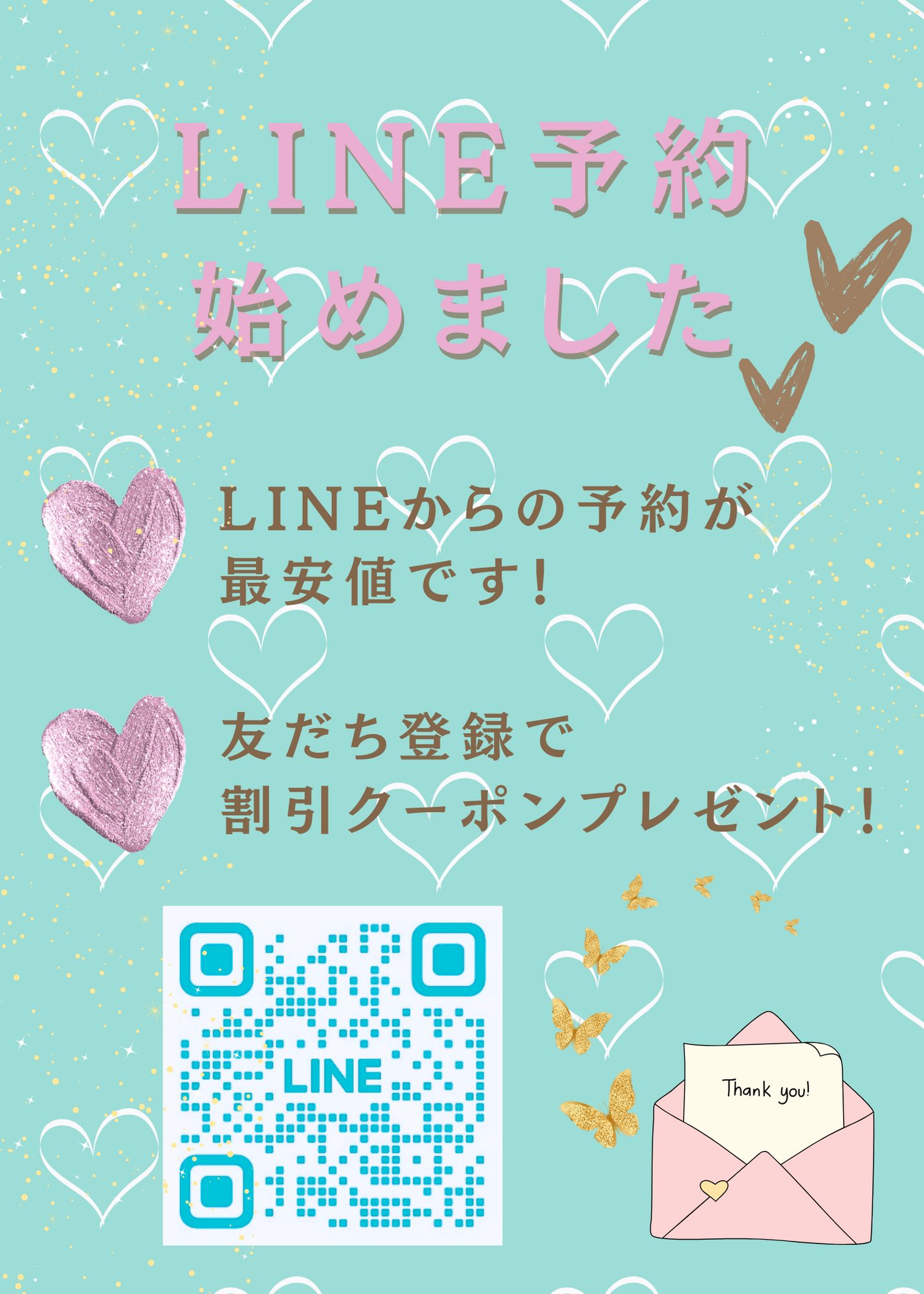 2024.01.20 LINE予約始めました これまでWEB予約のみでしたが、お客様からご要望頂いておりましたので、LINE予約を導入しました。 また問い合わせなども含め、すべてLINEで完結します。 LINEでの予約が一番お得となっていますので、ぜひLINEをご利用ください♪